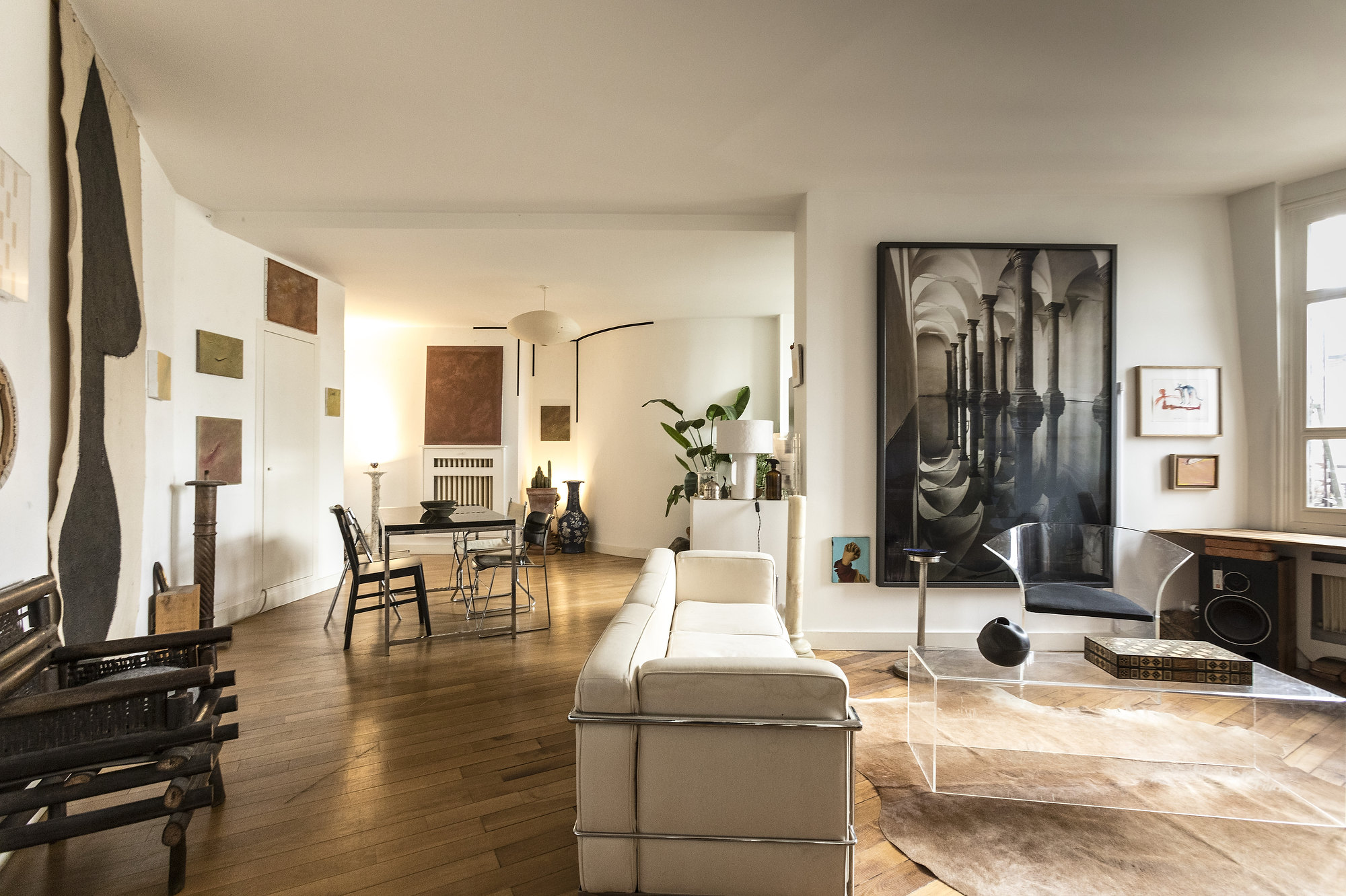 The large living room is divided into two areas, creating a harmonious living space. The dining area features a generous wooden table and chairs, and acts as the trait d’union between the kitchen and sitting area. This latter is adorned with a comfortable couche and an armchairs, around a glass coffee table. Parquet flooring enhances the warmth of the space, and large windows looking out onto the rooftops of buildings around an inner court, create a welcoming and peaceful ambiance. A desk under the window it's ideal for working with your PC.